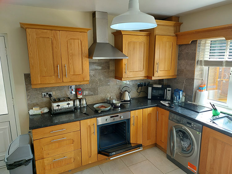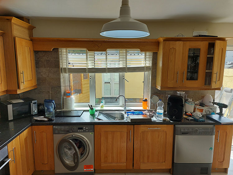 The original kitchen featured natural oak cabinetry that had become visually dated over time. While still in good condition, the colour and finish no longer suited a modern interior.